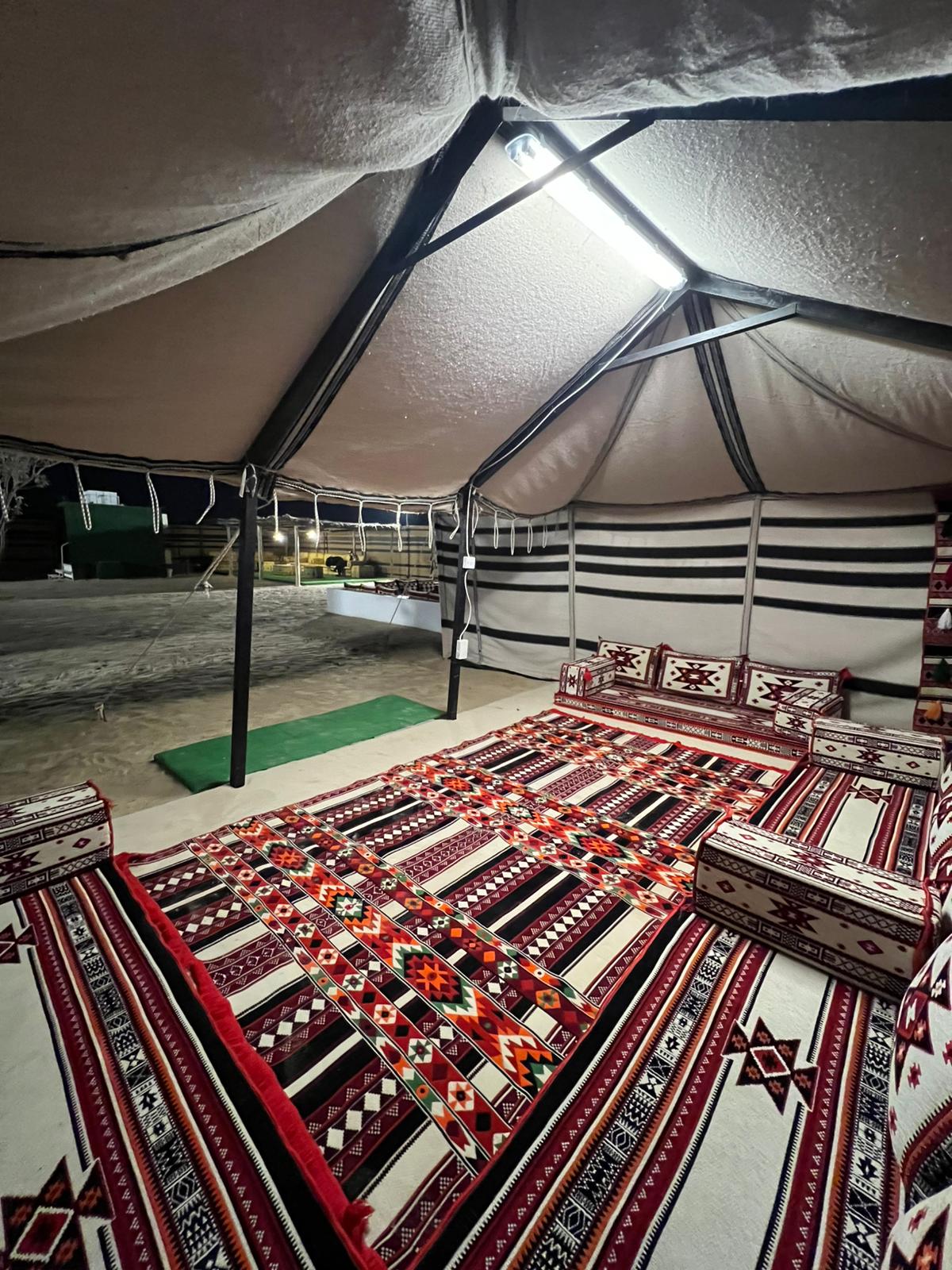 Enjoy a relaxing desert getaway at Al Rehlah Journey Camp, ideal for families, friends, and private gatherings. The camp offers comfortable indoor and outdoor seating, a cozy bonfire, TV, and restroom facilities, with space for up to 20 guests—perfect for socializing and unwinding in the desert.